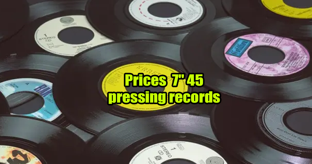 Prices 7″ 45 vinyl records mastering for 7″ records colour A-B labels front and back white paper poly lined sleeves, full colour record jackets no spine assembled shrink-wrapped.